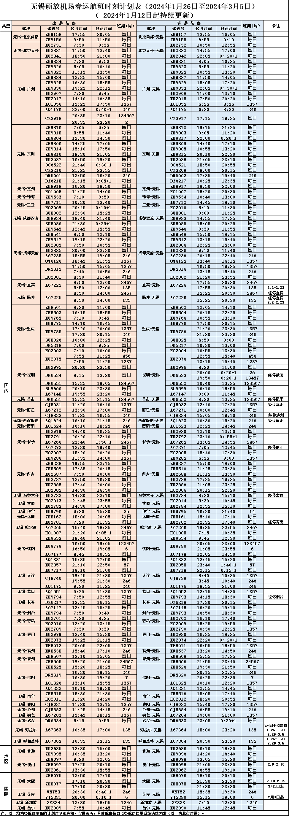 2月10日-15日及3月1日起新增:無錫=大阪航班,每日1班