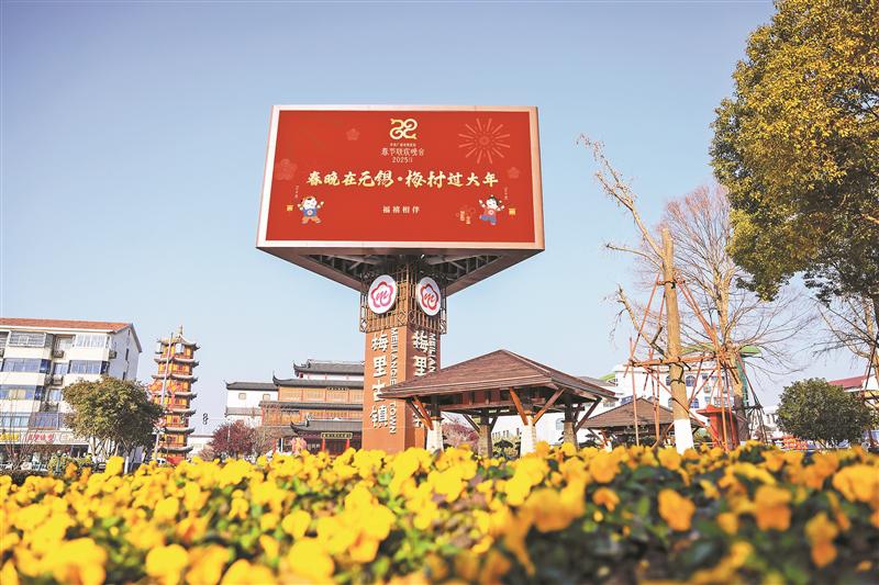 此外,無(wú)錫高新區(qū)各大交通要道的巨大電子屏幕滾動(dòng)播放著2025年中央廣播電視總臺(tái)春節(jié)聯(lián)歡晚會(huì)無(wú)錫分會(huì)場(chǎng)的吉祥物“乙長(zhǎng)福”和“巳有禧”。該區(qū)各大商圈也紛紛在店鋪顯示屏上展示春晚元素,營(yíng)造出濃郁的節(jié)日氣氛。公交車站的廣告牌、電子屏也換上了喜慶的紅色“新裝”。梅村街道的“春晚在無(wú)錫·梅村過(guò)大年”春晚主題公交車在城市中穿梭,成了街頭一道流動(dòng)的風(fēng)景線。