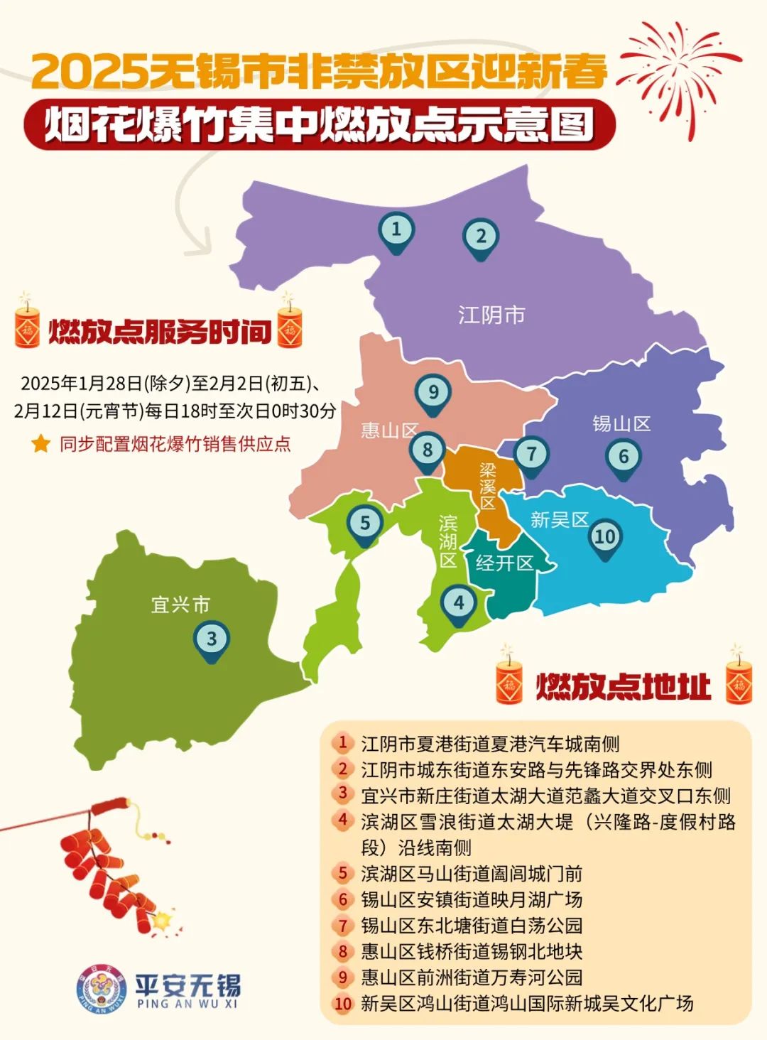 目前,無錫市區(qū)禁止銷售和燃放煙花爆竹區(qū)域?yàn)椋?/strong>環(huán)湖路-山水東路-震澤路-蠡湖大道-太湖-望虞河-運(yùn)河西路-高浪路-312國道-京滬高速-江陰界-錫澄運(yùn)河-312國道-錢威路-錢榮路構(gòu)成的環(huán)線內(nèi)區(qū)域。以上區(qū)域?yàn)閲?yán)管嚴(yán)控區(qū)域,請廣大市民自覺遵守禁放規(guī)定,不買不放煙花爆竹。如有燃放需要,請至非禁放區(qū)集中燃放點(diǎn)進(jìn)行安全燃放。需要注意的是,在非禁放區(qū)燃放煙花爆竹,應(yīng)遠(yuǎn)離以下禁放地點(diǎn)(區(qū)域):(一)國家機(jī)關(guān)駐地;(二)文物保護(hù)單位的保護(hù)范圍內(nèi);(三)軍事設(shè)施保護(hù)區(qū),車站、碼頭、機(jī)場等交通樞紐,鐵路線路和軌道交通安全保護(hù)區(qū),輸變電設(shè)施安全保護(hù)區(qū),輸油氣管道設(shè)施安全保護(hù)范圍內(nèi);(四)商場、集貿(mào)市場和公共文化設(shè)施、宗教活動等人員密集場所;(五)易燃易爆危險(xiǎn)物品生產(chǎn)、儲存場所和糧、油、棉等重要物資倉庫;(六)醫(yī)療機(jī)構(gòu)、養(yǎng)老機(jī)構(gòu)、幼兒園、學(xué)校、科研單位等場所;(七)山林、蘆灘和自然保護(hù)區(qū)等重點(diǎn)防火區(qū);(八)市、縣級市人民政府確定并公布的其他禁止燃放煙花爆竹的地點(diǎn)。