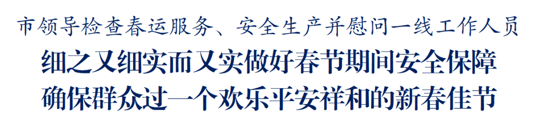 在新春佳節(jié)來臨之際,近日,市委書記杜小剛、市長趙建軍分別來到機場、車站、項目現(xiàn)場、企業(yè)、歷史街區(qū)、農(nóng)貿(mào)市場、飯店、煙花集中燃放點等處,檢查春運服務、安全生產(chǎn)等情況,向一線工作人員送上新春祝福,強調(diào)要深入學習貫徹習近平總書記關(guān)于安全生產(chǎn)的重要論述和對江蘇工作重要講話精神,按照省安委會全體(擴大)會議要求,以“時時放心不下”的責任感,細之又細、實而又實做好春節(jié)期間安全保障工作,確保廣大市民群眾度過一個歡樂平安祥和的新春佳節(jié)。