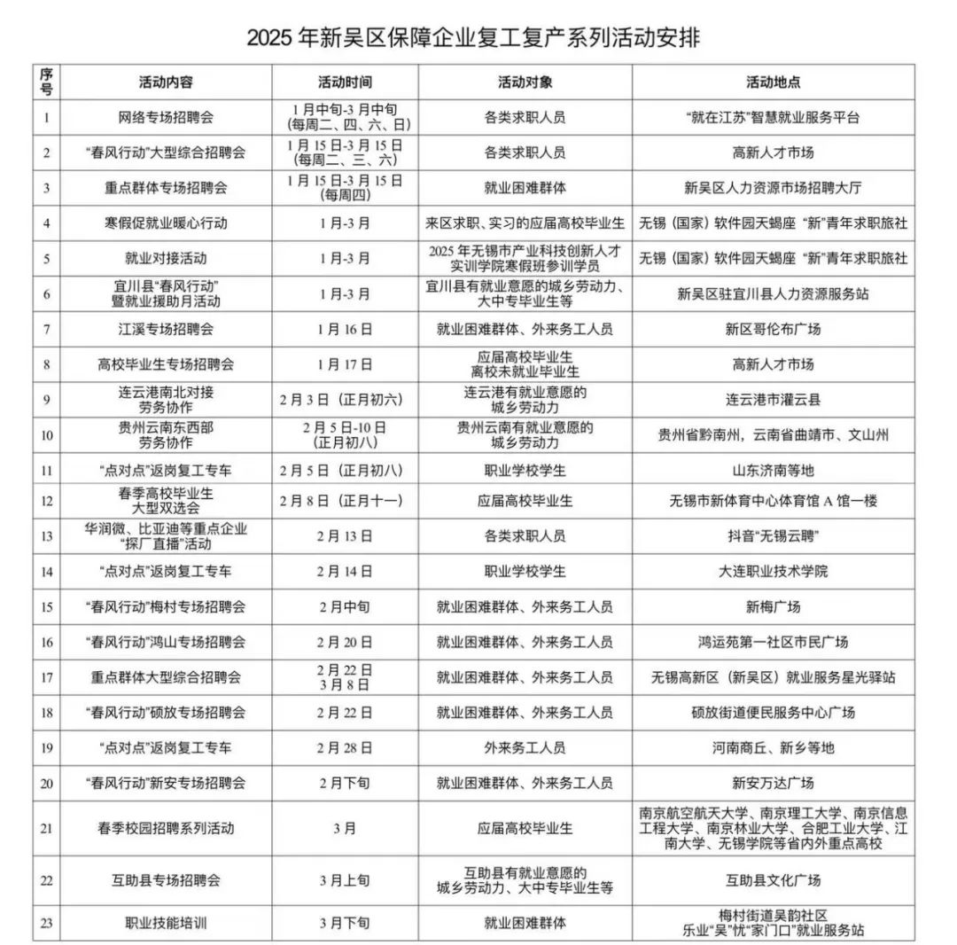 無(wú)錫高新區(qū)在春節(jié)前夕發(fā)布了2025年迎新春開(kāi)新局助企惠民及“樂(lè)享新春·約惠新吳”促消費(fèi)20條措施,把真金白銀的“政策紅利”變成穩(wěn)崗擴(kuò)崗的“發(fā)展紅利”。發(fā)放返崗擴(kuò)崗補(bǔ)助,對(duì)企業(yè)春節(jié)期間通過(guò)租用(含合租)大巴車等方式接回市外較集中地區(qū)員工所產(chǎn)生的包車費(fèi)用,給予50%的補(bǔ)助;春節(jié)期間為區(qū)內(nèi)企業(yè)引進(jìn)首次來(lái)錫就業(yè)10人(含)以上的人力資源機(jī)構(gòu),按引進(jìn)職工人數(shù)給予800元/人的補(bǔ)助。積極落實(shí)一次性擴(kuò)崗補(bǔ)助,對(duì)符合條件的企業(yè),按招用1人給予1500元的標(biāo)準(zhǔn)發(fā)放補(bǔ)貼。開(kāi)展“新”青年求職旅社暖心服務(wù),為高校畢業(yè)生提供最高6天免費(fèi)住宿,最高1000元交通補(bǔ)貼,開(kāi)展才企匹配、就業(yè)指導(dǎo)、政策咨詢、城市融入、企業(yè)參訪等一攬子公益服務(wù),幫助企業(yè)引才留才降本增效,為企業(yè)發(fā)展提供更多新鮮血液。