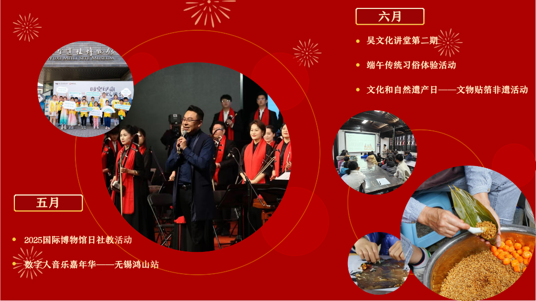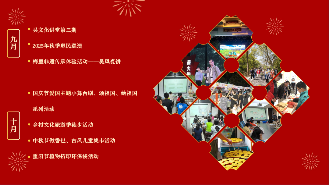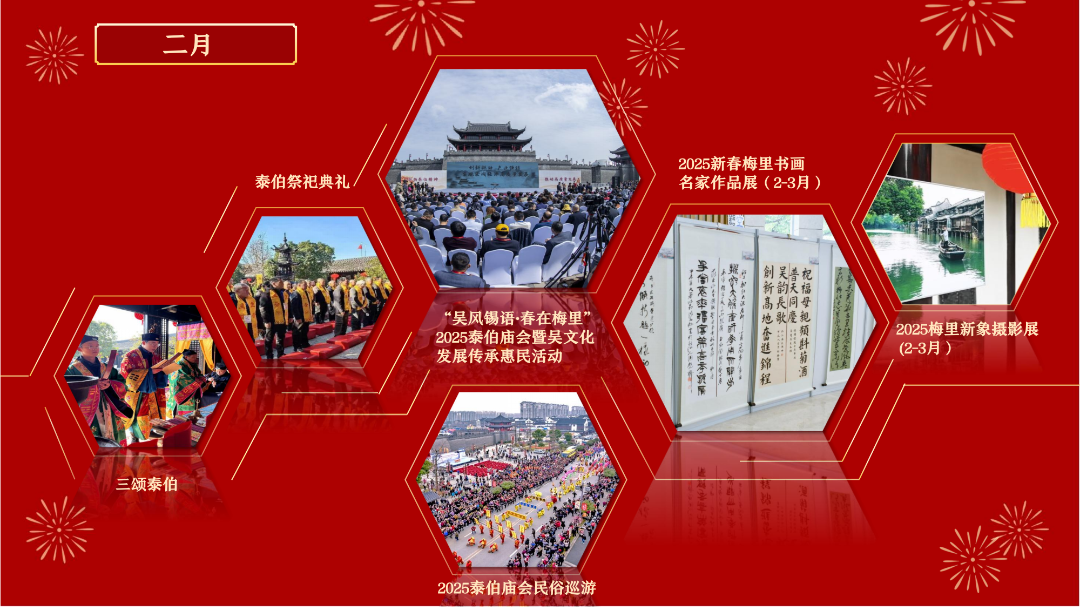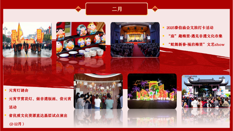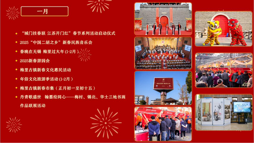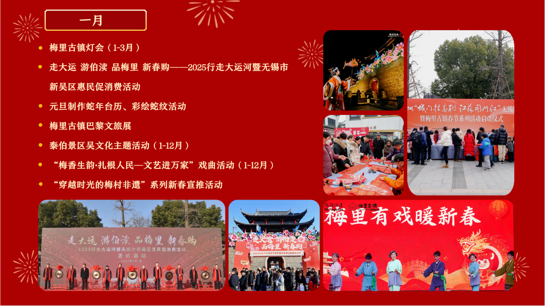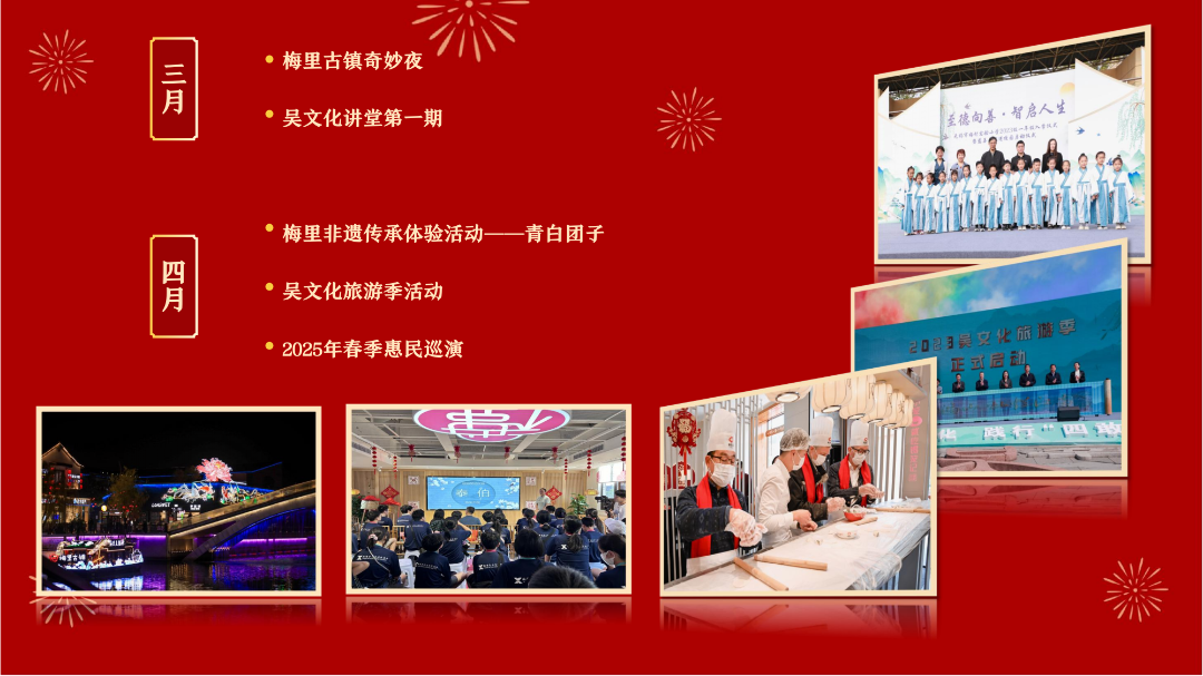 今年,吳文化發(fā)展傳承惠民活動(dòng)帶來(lái)多彩文化盛宴,將開(kāi)展省優(yōu)質(zhì)文化資源直達(dá)基層試點(diǎn)演出、“走大運(yùn) 游伯瀆 品梅里 新春購(gòu)”2025行走大運(yùn)河暨無(wú)錫市新吳區(qū)惠民促消費(fèi)活動(dòng)、2025“中國(guó)二胡之鄉(xiāng)”新春民族音樂(lè)會(huì)、“春晚在無(wú)錫 梅里過(guò)大年”、梅里古鎮(zhèn)新春市集、三頌泰伯、2025泰伯廟會(huì)民俗巡游、梅里古鎮(zhèn)奇妙夜、吳文化講堂、吳文化旅游季、葡萄文化旅游季開(kāi)幕式、錢(qián)氏素書(shū)堂開(kāi)蒙禮等50余項(xiàng)上百場(chǎng)演出,特別是省優(yōu)質(zhì)文化資源直達(dá)基層各類演出已達(dá)50余場(chǎng),可謂月月有活動(dòng)、月月有精彩。