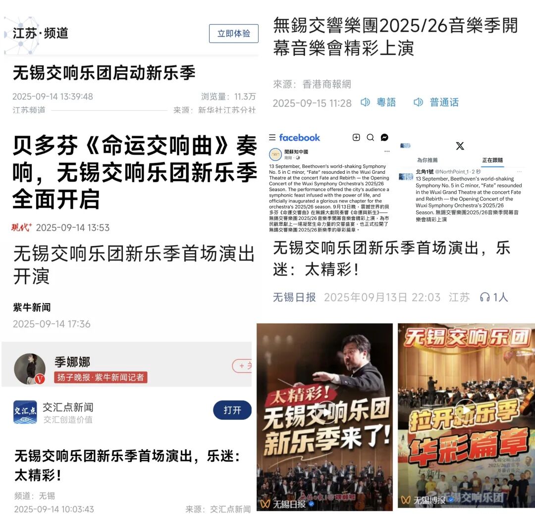 交匯點(diǎn)新聞、紫牛新聞、現(xiàn)代+客戶端、香港商報(bào)、無錫日?qǐng)?bào)、無錫廣電等主流媒體也紛紛報(bào)道無錫交響樂團(tuán)啟動(dòng)新樂季。