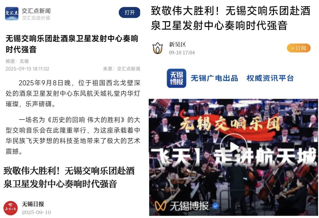 發(fā)布《無錫交響樂團(tuán)赴酒泉衛(wèi)星發(fā)射中心奏響時(shí)代強(qiáng)音》,報(bào)道為紀(jì)念中國(guó)人民抗日戰(zhàn)爭(zhēng)暨世界反法西斯戰(zhàn)爭(zhēng)勝利80周年,無錫交響樂團(tuán)與內(nèi)蒙古藝術(shù)劇院交響樂團(tuán)合作演出,無錫交響樂團(tuán)原創(chuàng)的交響組曲《飛天》成為本場(chǎng)音樂會(huì)的最大亮點(diǎn)。