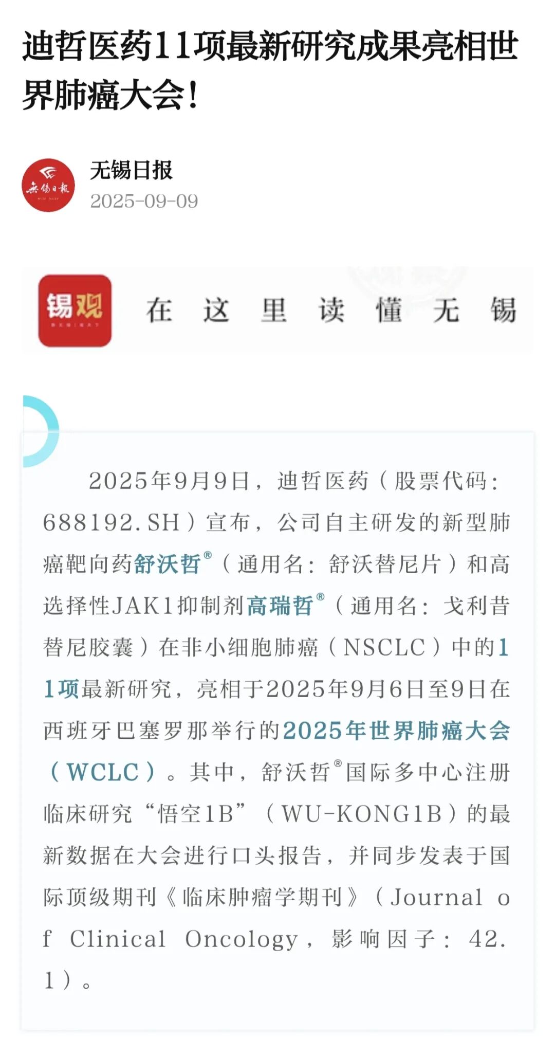 關(guān)注我區(qū)企業(yè)迪哲醫(yī)藥公司自主研發(fā)的新型肺癌靶向藥舒沃哲®(通用名:舒沃替尼片)和高選擇性JAK1抑制劑高瑞哲®(通用名:戈利昔替尼膠囊)在非小細(xì)胞肺癌(NSCLC)中的11項(xiàng)最新研究,亮相于2025年9月6日至9日在西班牙巴塞羅那舉行的2025年世界肺癌大會(huì)(WCLC)。