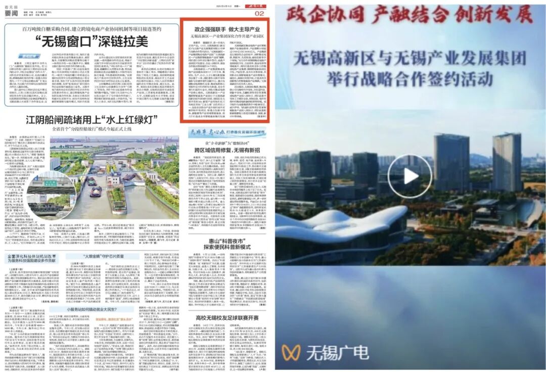 報(bào)道我區(qū)與無錫產(chǎn)業(yè)發(fā)展集團(tuán)有限公司舉行戰(zhàn)略合作簽約活動(dòng),“無錫高新區(qū)—產(chǎn)業(yè)集團(tuán)集成電路產(chǎn)業(yè)園”“無錫高新區(qū)—產(chǎn)業(yè)集團(tuán)智能裝備產(chǎn)業(yè)園”揭牌,同時(shí)進(jìn)行合作項(xiàng)目集中簽約,涵蓋產(chǎn)業(yè)園區(qū)開發(fā)建設(shè)、企業(yè)入園培育、基金合作聯(lián)動(dòng)等領(lǐng)域的14個(gè)項(xiàng)目,全力打造政企協(xié)同、產(chǎn)融結(jié)合、創(chuàng)新發(fā)展的標(biāo)桿典范。
