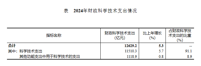 2024年,國家財(cái)政科學(xué)技術(shù)支出12629.2億元,比上年增加633.3億元,增長5.3%。其中,中央財(cái)政科技支出4192.5億元,占全國財(cái)政科技支出的比重為33.2%;地方財(cái)政科技支出8436.7億元,占比為66.8%。