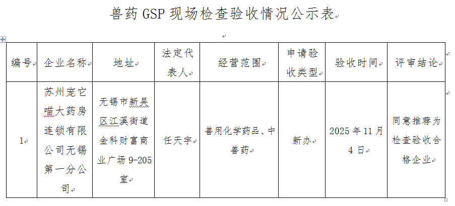 根據(jù)《獸藥經(jīng)營質(zhì)量管理規(guī)范》(農(nóng)業(yè)部令2010年第3號(hào))和《江蘇省獸藥GSP檢查驗(yàn)收辦法》的規(guī)定,按照《江蘇省獸藥GSP檢查驗(yàn)收評(píng)定標(biāo)準(zhǔn)》和《江蘇省獸藥GSP現(xiàn)場(chǎng)檢查工作程序》的要求,11月4日我局組成檢查驗(yàn)收組對(duì)申請(qǐng)驗(yàn)收的蘇州寵它喵大藥房連鎖有限公司無錫第一分公司進(jìn)行了獸藥GSP(不含獸用生物制品)現(xiàn)場(chǎng)檢查驗(yàn)收,檢查中發(fā)現(xiàn)存在3項(xiàng)一般缺陷。11月10日,蘇州寵它喵大藥房連鎖有限公司無錫第一分公司提交了整改報(bào)告,經(jīng)審核,該獸藥經(jīng)營單位符合《江蘇省獸藥GSP檢查驗(yàn)收評(píng)定標(biāo)準(zhǔn)》規(guī)定的內(nèi)容,現(xiàn)將檢查驗(yàn)收結(jié)果予以公示。公示期為2025年11月10日至2025年11月16日,若有異議,請(qǐng)將意見反饋到新吳區(qū)農(nóng)業(yè)農(nóng)村局(地址:無錫市新吳區(qū)凈慧東道70號(hào)綜合服務(wù)中心9樓909)。