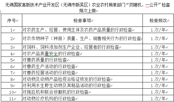 無錫國家高新技術產業(yè)開發(fā)區(qū)(無錫市新吳區(qū))農業(yè)農村局單部門“雙隨機、一公開”檢查頻次和標準 |